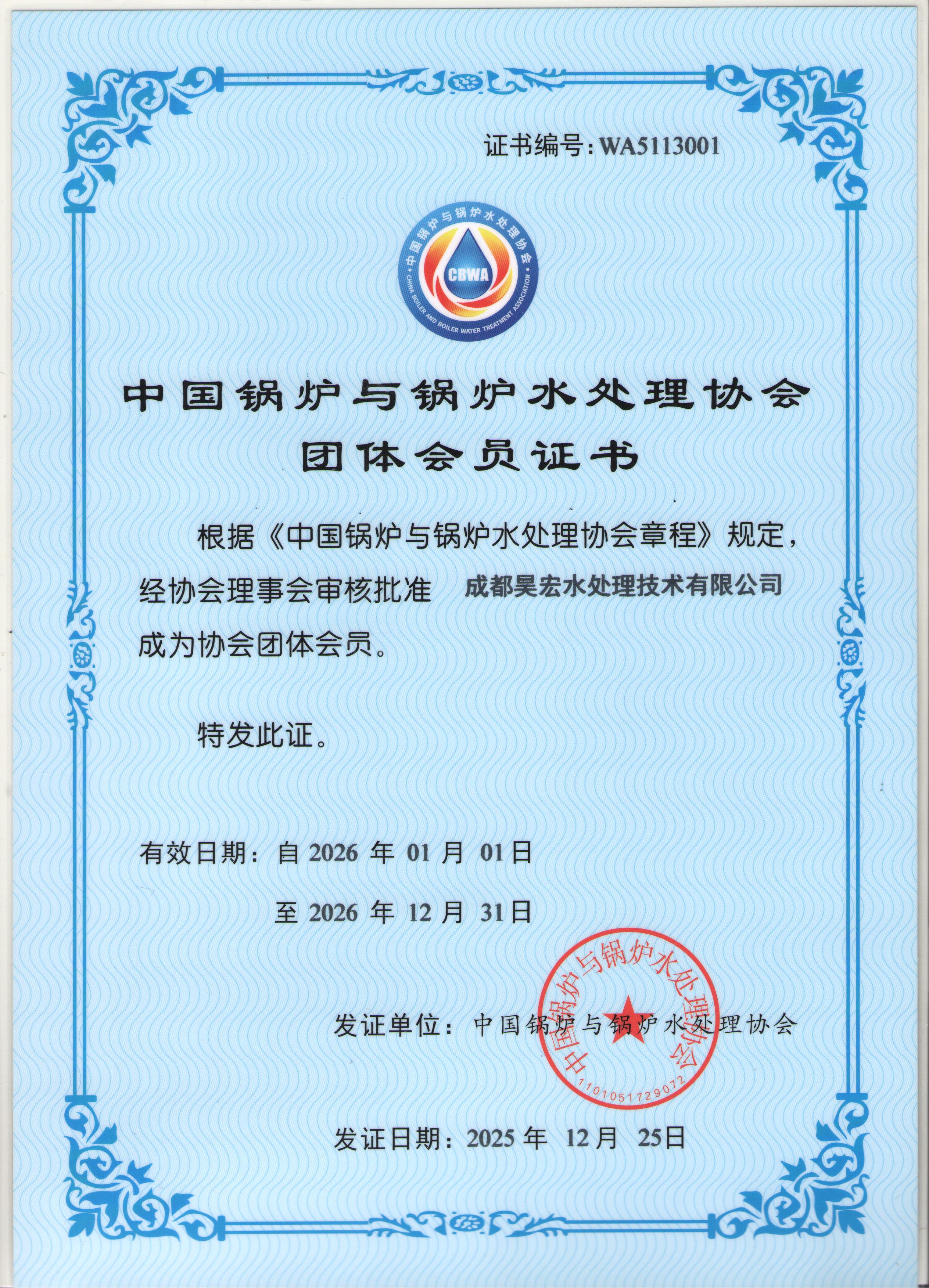 中国锅炉与锅炉水处理协会团体会员证书