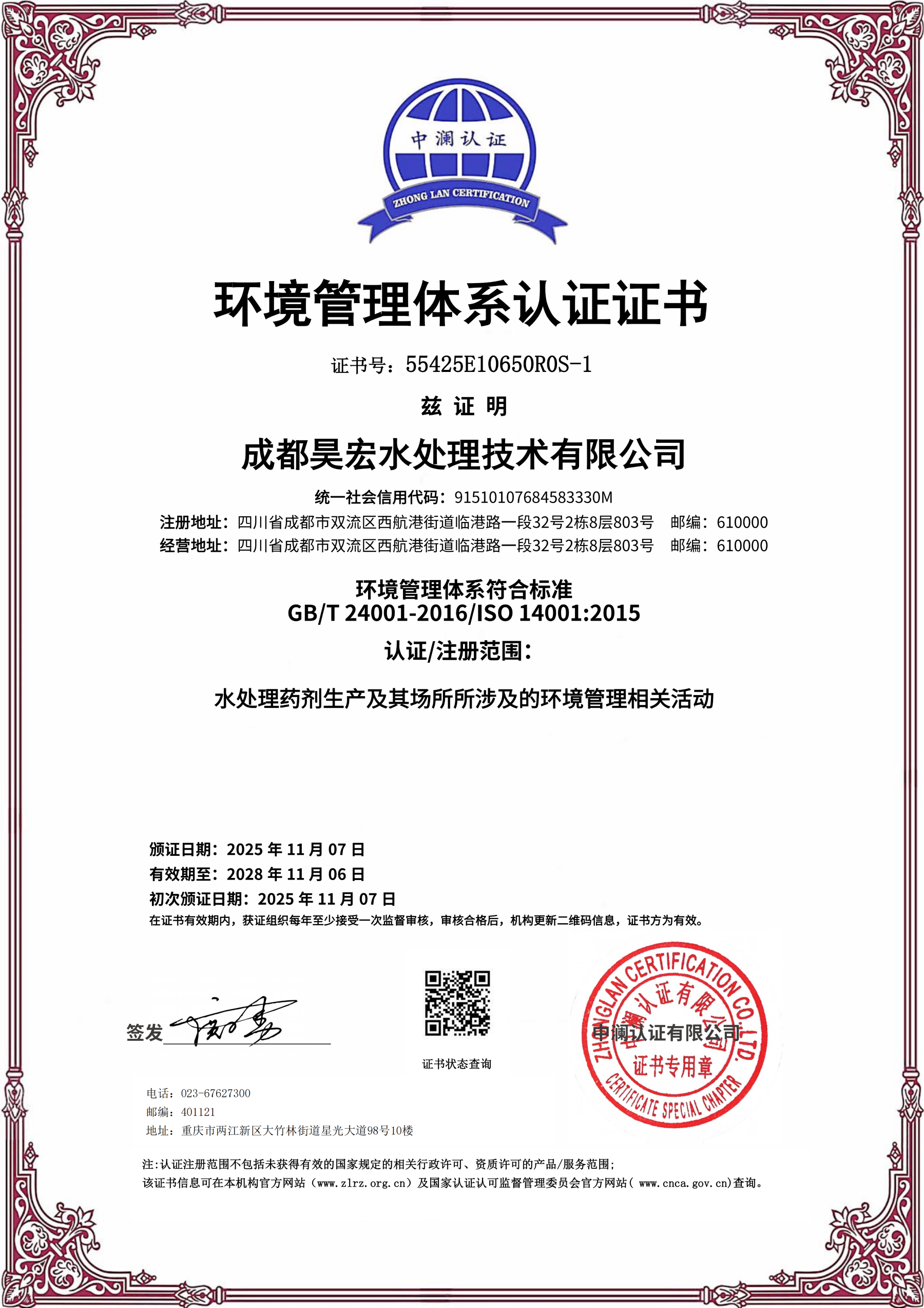 环境管理体系认证证书
